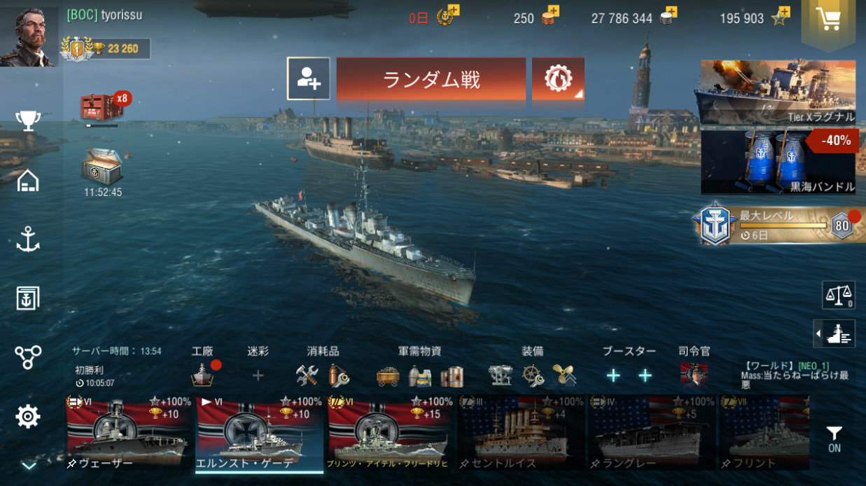 任務箱から出て即売却したのを、パーソナルチャレンジ用に買い戻したやつ。元ネタは1934型駆逐艦の設計候補の一つ。12.7cm砲(実際の太さは12.8cmでありゲーム内でもそうなっている)を5門載せるのと4門載せて後から15cm砲に換装するかを検討した結果、前者が採用され本案は廃案になったそうな。搭載予定だった15cm/48TbtsKC/36は欠陥砲として有名ですので、ドイツの判断は正しかったといえる。wowsbでは最初から150mm砲を搭載していたものの、あまりにも不評で128mm砲へ置き換えたという史実再現()。ここまで読むと128mm砲を4門と、他国と同程度の魚雷を備えた平凡な駆逐艦と思ってしまうところ。だがしかし何故かエルンストゲーデの128mm砲だけドイツを含めた他の5インチ級駆逐艦砲よりも与ダメが高く設定されており、おかげで駆逐艦との撃ち合いでかなり優位に戦えちゃいます。高速装填持ちのフランス駆逐に対してだけは不利となりますが、その分転舵性能が高めなため距離を詰めやすく、追撃力に関しては本艦の方が高いかなと感じました。普通に強いってやつです。史実のイメージとは違った活躍をしてくれることでしょう。
