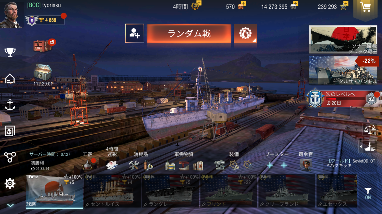 今月のバトルパス報酬で入手。通常ツリー艦ではありますが、まだ未保有だったのでありがたい。日本艦の史実ネタは艦これwiki見ろ定期。wowsbではバランス調整のためか、史実よりも速力が低く抑えられております。速過ぎてすまん。それでも同ティア最速巡洋艦なのは変わらないため、有利ポジを取りやすいですね。しかしながらティア5に40ノットを超える巡洋艦が複数存在していることもあって、ボトム戦では欠点ばかり目立ってしまうのがつらいところ。基本的に巡洋艦同士の戦いは避けた方がよさそうです。同じティアに似たような性能で球磨よりも砲力高めなフェニックスが居ることですし、速力に拘るより旋回を上げて両舷の魚雷をばら撒いた方が楽しめるかもしれません。