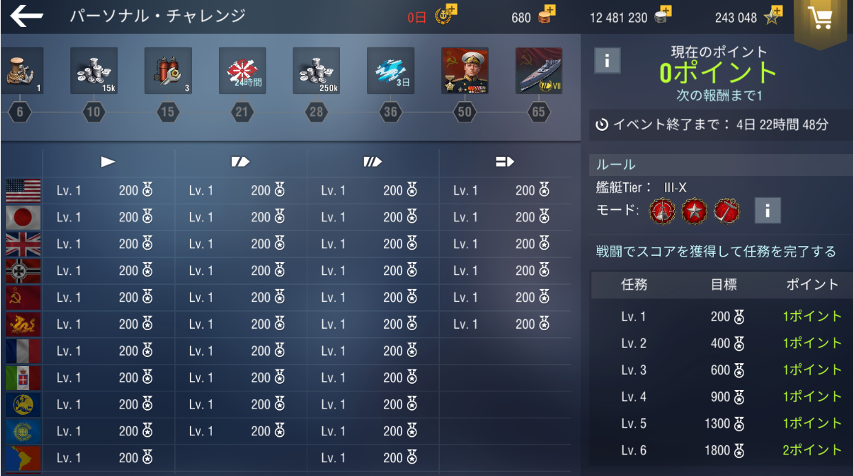 World of Warships Blitz 二回目のパーソナルチャレンジが始まったわけだが nanashi64 ゴールが遠くなってますね…。低ティア艦で65ポイント貯めるのは、かなりつらいと思われます。前回のパーソナルチャレンジを制覇した人が想定よりも多かったのでしょう。これが簡悔ってやつですか。ブラックグラーフ以外の報酬で本気を出す気は起きませんので、50ポイントで入手できるソ連艦長を目指して頑張りたいと思います。 著者について nanashi64 Administrator ウェブサイトにアクセスしてください すべての投稿を表示します Post navigation Previous: 巡洋艦球磨Next: 中戦車Progetto46 コメントを残す コメントをキャンセルメールアドレスが公開されることはありません。 ※ が付いている欄は必須項目ですコメント ※ 名前 メール サイト 関連するストーリー World of Warships Blitz World of Warships Blitz日記365・戦艦コネティカット nanashi64 World of Warships Blitz World of Warships Blitz日記364・駆逐艦ツェアシュテーラー1 nanashi64 World of Warships Blitz World of Warships Blitz日記363:航空母艦・飛龍41 nanashi64