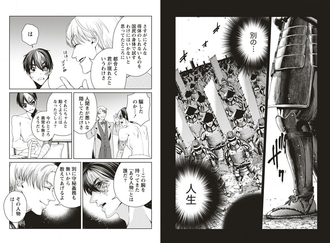 同じころ手術に成功した主人公。まだリハビリ中なものの、9話ぶりに両腕が使えるようになりました。ただこの腕、異世界人の一部っぽいんですよね。切り取ったのか…?別の作品で見た光景だ。オリジナルではなくクローンだと思いたい。本格的に主人公が復帰しそうなところで11話おわり。主人公が居なくても勝っちゃいそうな雰囲気だけど、見せ場もほしいかな。