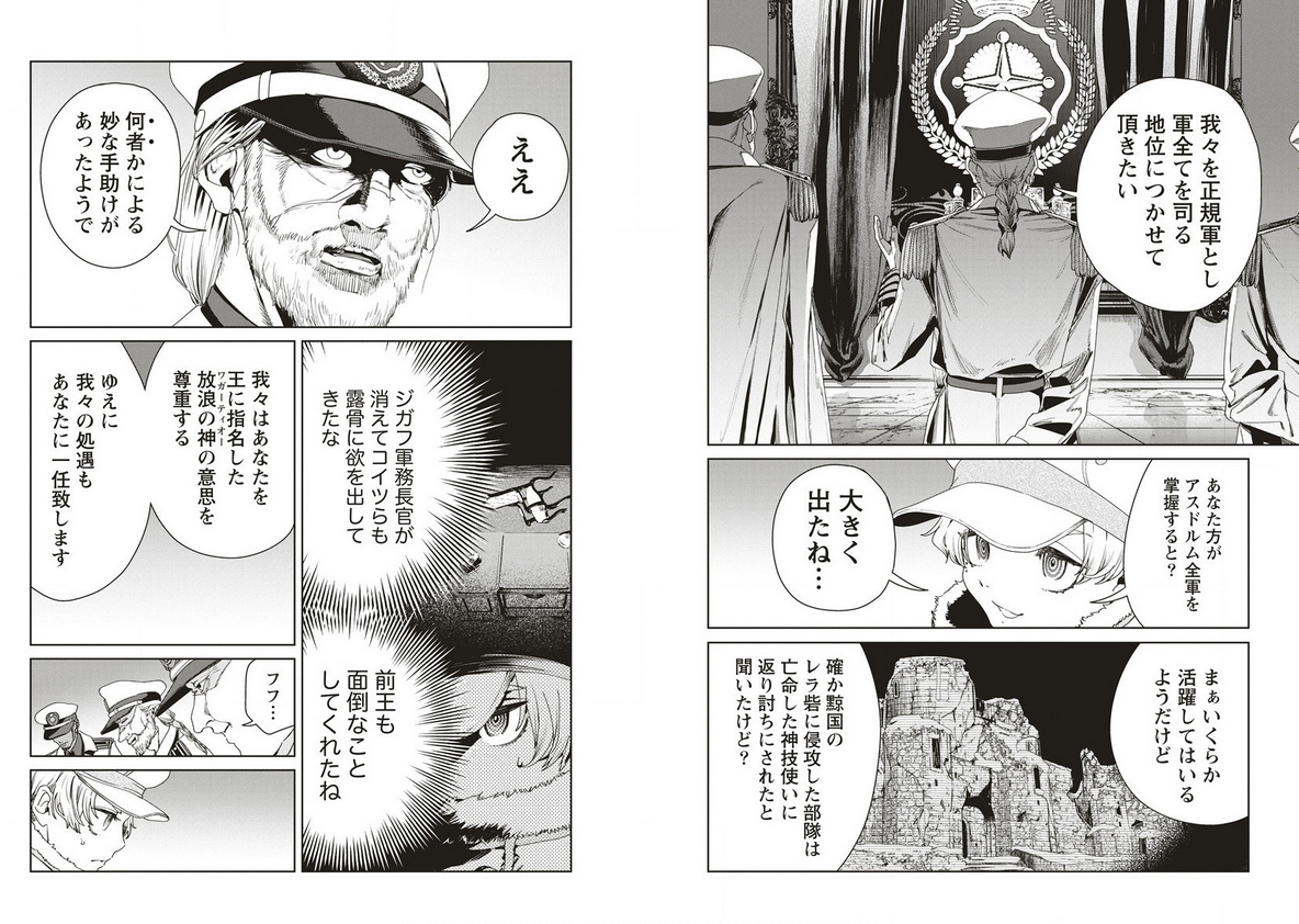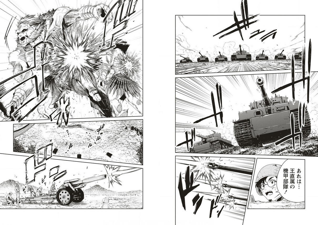 ガルグイユ皇国vsアスドルム王国第2ラウンド。前話で死に掛けていたミールは、友軍である機甲部隊の参戦により危機を脱しました。但し皇国の勢いはまだ止まっておりません。ドラゴンと巨人に続き獣人を主力とした歩兵部隊の突入も行われ、現段階では皇国側が優勢といったところ。