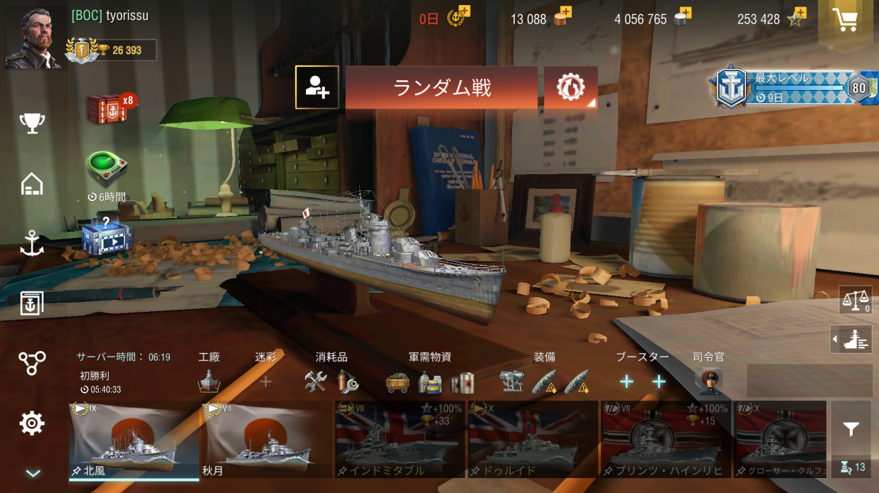 語りたい気分だったのでここまで進めてみました。ティア10の春雲は架空艦だし強そうにも思えないからいいかなって。改秋月型の1隻とされる北風です。当時の関係者が書いた本では秋月改型と呼ばれているものの、若干の設計変更が行われた冬月も同じように呼ばれていたりするので、改秋月型と言った方が無難かと思われます。改良点は甲型駆逐艦(後の島風)との機関を共通化したに留り、基本性能は秋月型と大差なかったりします。wowsbに於いてはゲームバランスを考慮してか史実では廃止された次発装填装置を搭載していることになっており、スキルを使用することで魚雷12本を発射可能という雷駆的な位置づけになっています。しかしながらティア9の戦場でこの雷力を生かせる場面は少なく、脅威のボトム率も合わさり非情に不利な戦闘を強いられます。高性能戦後艦が北風を襲う。タイマンを避け、味方の攻撃可能範囲内で戦うことを意識しながら頑張って戴きたい。