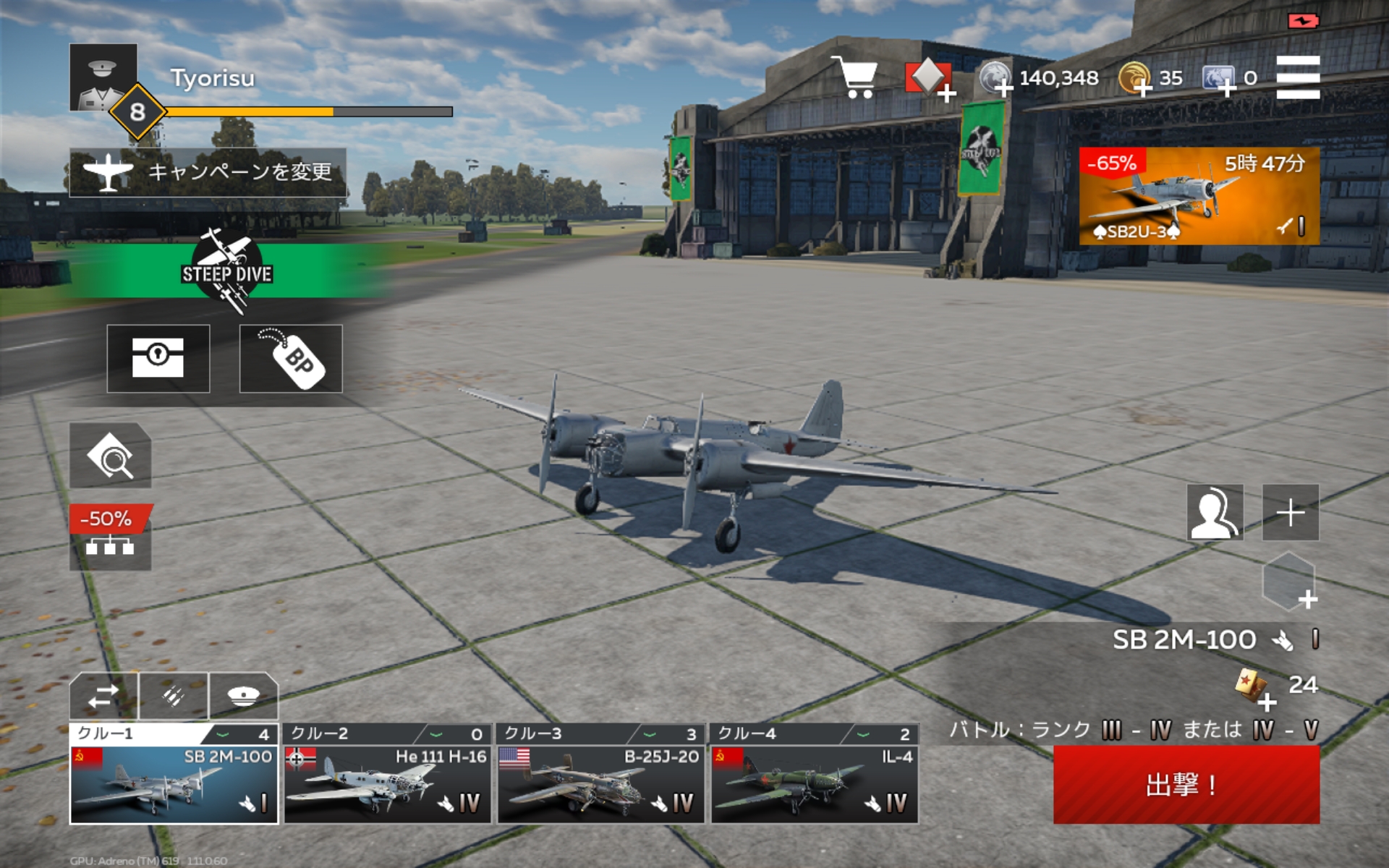 4スロット分埋めるべく他国の爆撃機ツリーも進めます。ソ連ツリー最初の爆撃機エスベー。同世代にあたる九七式戦闘機の搭乗員に撃墜困難とまで言わしめた高速爆撃機です。戦闘機並みの上昇力を持った機体でもあり、スペイン内戦では双発戦闘機としても活用されたそうな。wtmに於いてもランク1最速の爆撃機(2024年11月現在)として実装されており、同じランクにまともな迎撃機(wtmでは戦闘機寄りの攻撃機として実装され、爆撃機と同じ高度でリスポンする)が存在しないことと相まり史実のイメージ通りに戦うことが出来ます。少な目な爆弾積載量についても、このランク帯の小基地をリロードなしで破壊できる最低限の火力は出せるため、それほど気になりません。ソ連機の優秀さを実感できます。