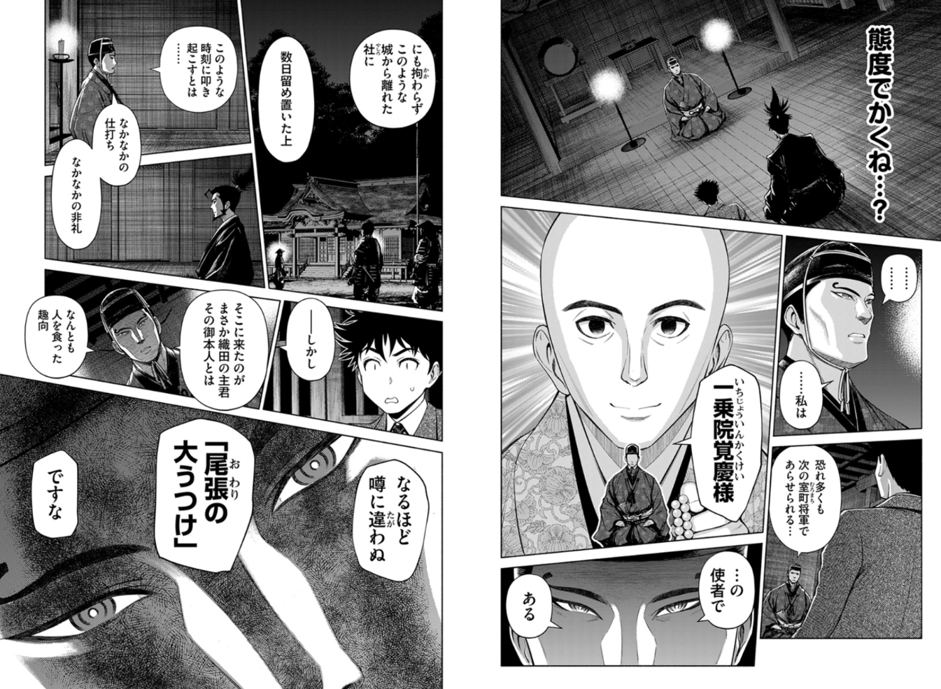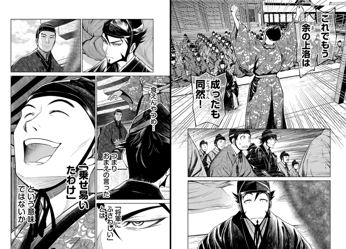 これに対しあくまでも室町幕府の存続を主張する藤孝。次期将軍になる予定の足利義昭は、信長を怒らせてでも仕える価値がある人物だそうな。急にヤクザものみたいな空気になってきました。前話のノリが嘘のようだ。引き下がらない藤孝の覚悟を見て一度は義昭に会ってみようという流れに。