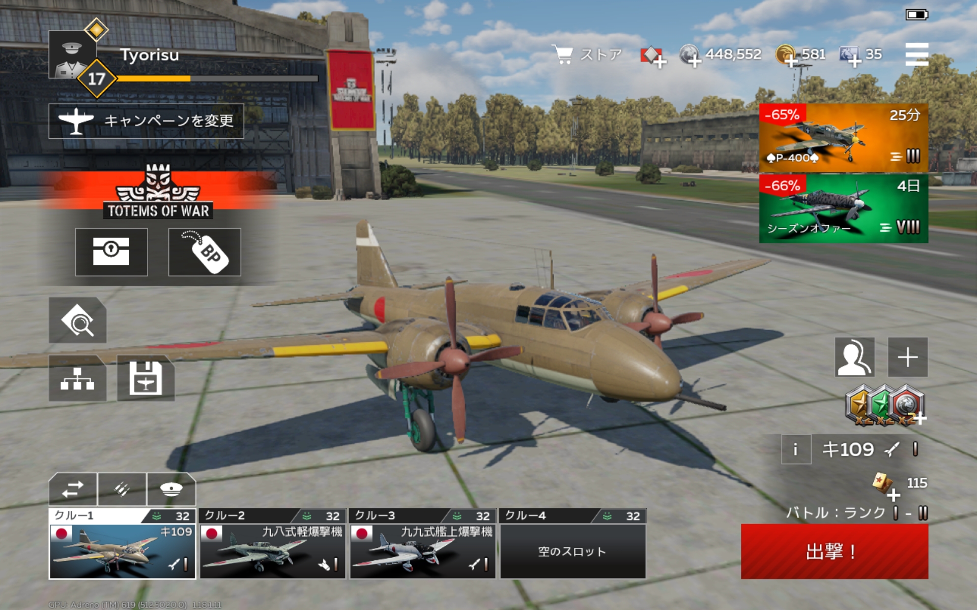 公式機種は特殊防空戦闘機。75mm砲を搭載したロマン機です。37mm機関砲の搭載も検討されたけど、最終的に却下されたそうな。移動可能な高射砲としてそれなりに期待されたものの、実戦では全く戦果を挙げられないまま敗戦を迎えることになります。wtmに於いてはランク1に大戦末期の機体ということで、戦闘機と比べても遜色の無い飛行性能を発揮できます。防護火器や防弾はベースである四式重爆撃機よりも劣化したそうですが、攻撃力の低いランク1なら平均的な耐久力です。ただ75mm砲弾を当てるのはこのランクでも難しく、対地用途でも他の機体で小型爆弾をばら撒いた方が効率良いです。ハッキシ言って味方にこいつが居ると負けを悟りますはい。