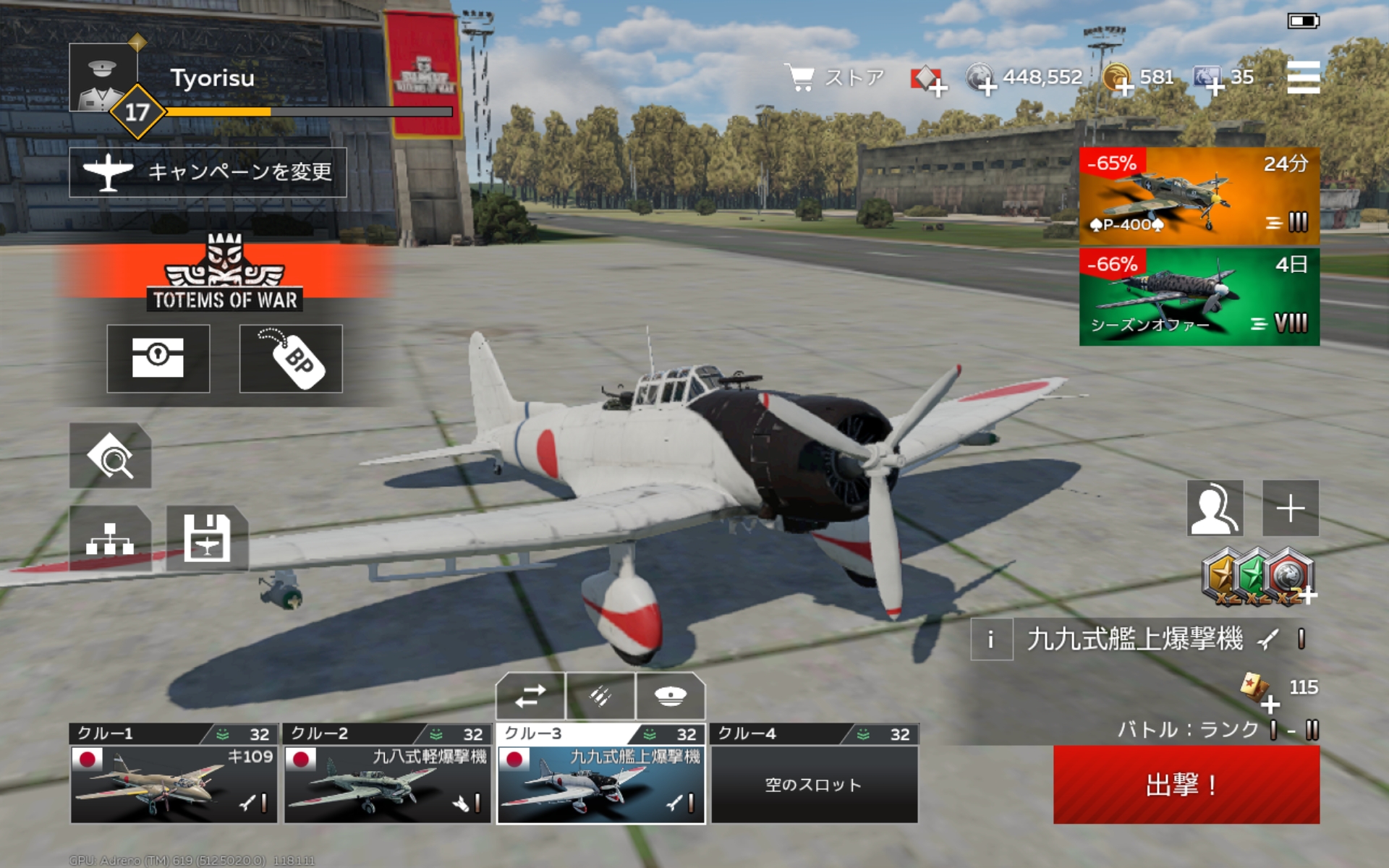 War Thunder Mobile War Thunder Mobile日記073・九九式艦上爆撃機 nanashi64 1 分読み取り 史実云々は艦これwikiに詳しく書いてあるからそっち見てね。wtmでは攻撃機枠での実装ということで、爆撃機枠で実装されている九八式軽爆撃機と比べると残念な仕上がり。いやまあ史実通りの兵装だけどさあ。搭載量少ないし固定武装しょぼいし良いとこないじゃんこれ。研究だけしてスルーすることを推奨したい。 著者について nanashi64 Administrator ウェブサイトにアクセス すべての投稿を表示 投稿ナビゲーション 前: War Thunder Mobile日記072・九八式軽爆撃機次へ: 火薬より魔法だよね コメントを残す コメントをキャンセルメールアドレスが公開されることはありません。 ※ が付いている欄は必須項目ですコメント ※ 名前 メール サイト 関連記事 War Thunder Mobile War Thunder Mobile日記119・戦闘機F4U-4 nanashi64 0 War Thunder Mobile War Thunder Mobile日記118・巡洋艦スヴェルドロフ nanashi64 0 War Thunder Mobile War Thunder Mobile日記117・戦闘機雷電三三型 nanashi64 0