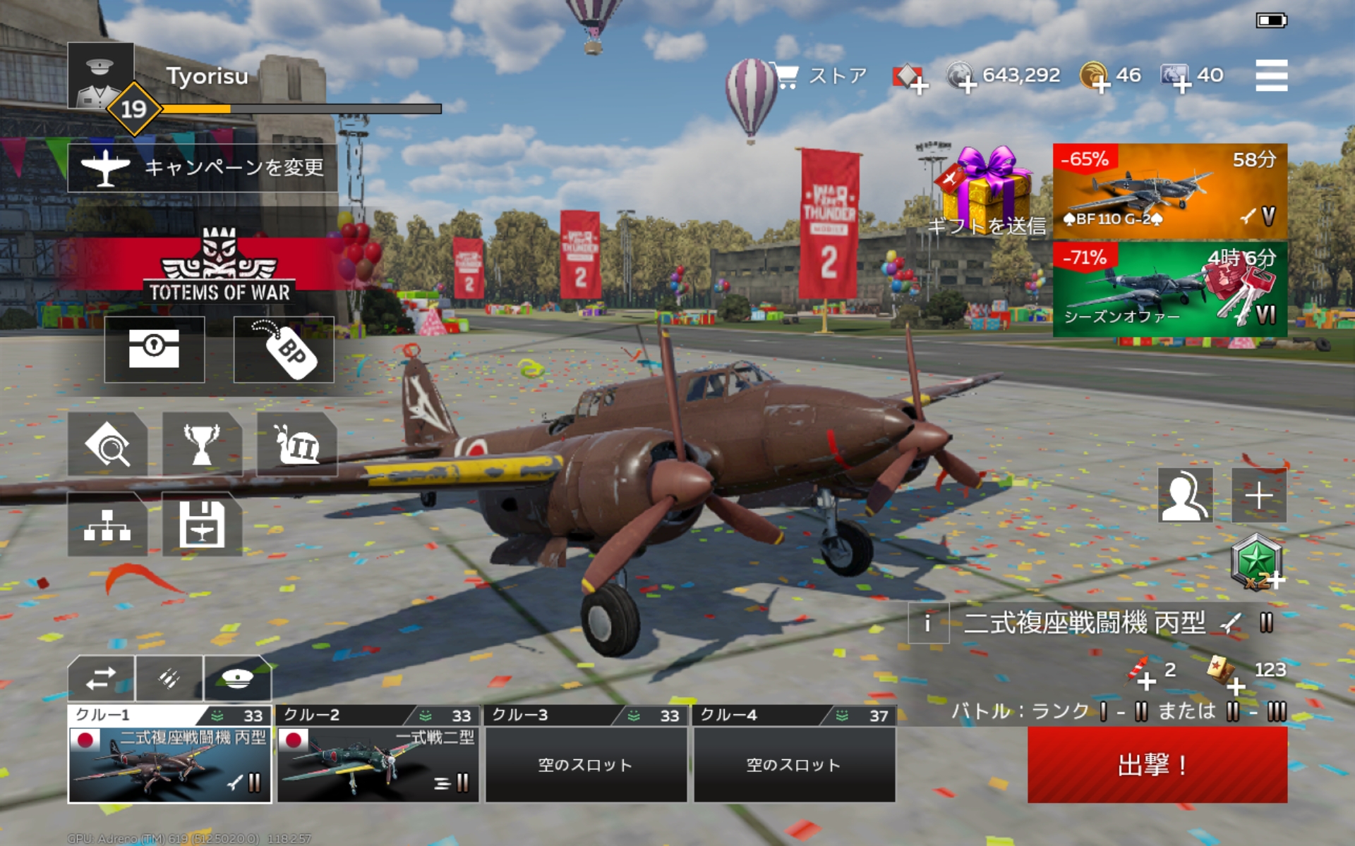 史実云々は艦これwiki見ろ定期。補足しておくと本機が単発戦闘機に劣ることは制式化前から分かっていたことで、遠距離戦闘機としても一式戦闘機の方が優れていると判断されていました。それでも採用したのはB-17のような大型爆撃機を撃ち落とすための重武装が評価されたからであり(当時の帝国陸軍飛行隊に20mm機関砲を搭載できる戦闘機は存在しなかった)、敵戦闘機に負けたのは二式複戦が弱かったというよりも相手を舐めていたというのが実情でありましょう。仮想目標だったB-17と類似品のB-24に対しては期待通りの強さを発揮したわけですし、想定外の運用をして不当に評価されているきらいがありますな。wtmで実装されているのは37mm機関砲を搭載したタイプ。この手の機関砲はYP-38で体験したのでなんとなく予想できておりましたが、めっちゃ当て難いです。。。IL-2-37だと当て難いとは思わなかったので、1門だけ載せるってのはやめてほしいですねぇ。37mm×2か20mm×2どちらかに統一してほしいところ。ランク2双発戦闘機(分類上は攻撃機)はYak-2が最強ってハッキシしてんだね
