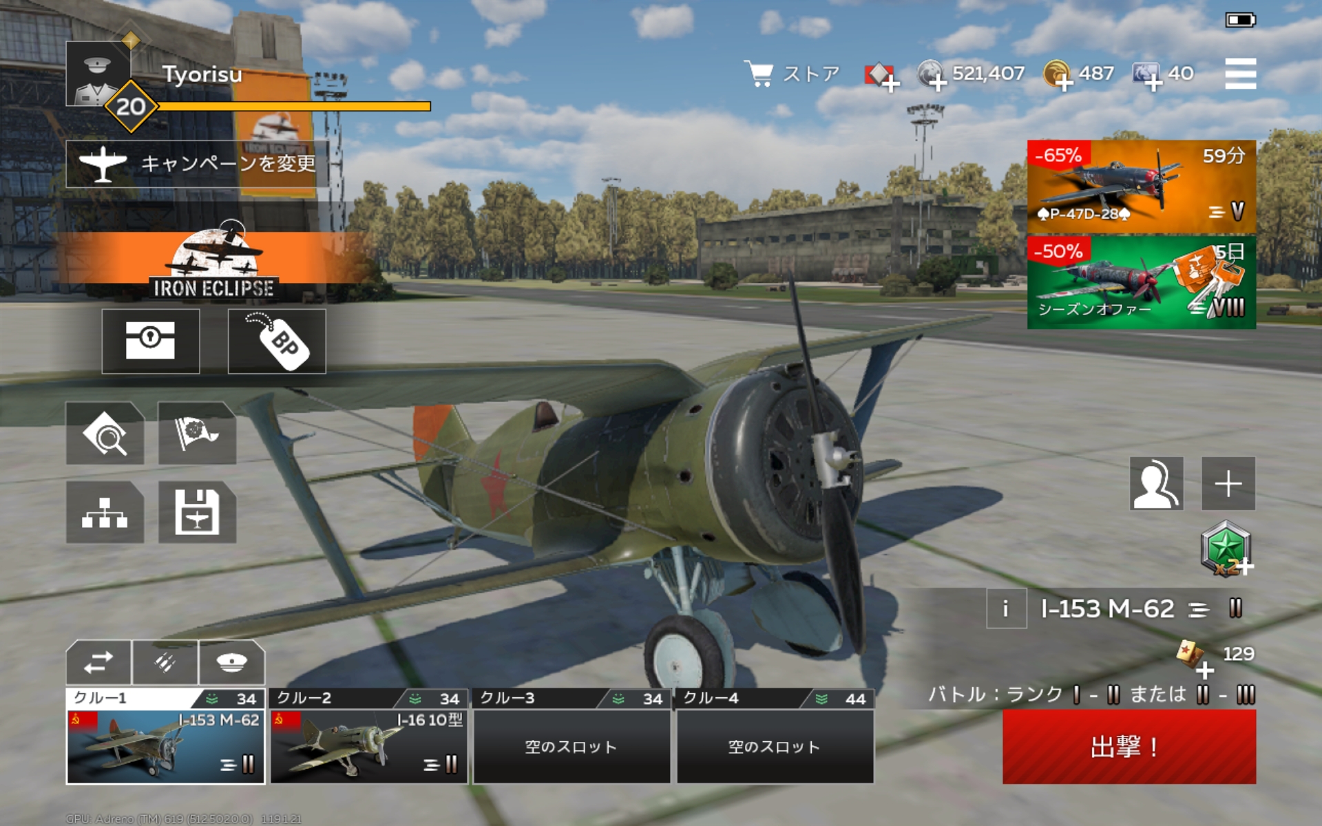 スペイン内戦でI-16が複葉機であるCR32に対し予想外の苦戦を強いられたことから、ソ連でも複葉戦闘機を廃止するのは時期尚早と考えられ研究が続行されることに。その結果生まれたのが本機になります。I-15から順当に進歩し、実戦でもノモンハンで猛威を振るった九七式戦闘機に対し互角の格闘戦を行える性能を発揮した反面、低速であったことから総合的な空戦性能はそれよりも劣ると判断されました。ノモンハンの戦い以前から速度性能の向上が求められ、更なる発展型であるI-190やI-195の開発が始まったものの、やはり複葉機であることから速力の向上は限定的であり、以後全面的に単葉戦闘機へと置き換えられていくことになります。wtmでは対地装備が可能になったI-15と言った感じ。そのせいであんま強そうに思えなかったのですが、一式戦闘機の項目でも述べたようにランク1よりランク2の方が旋回性能の高さを生かし易いんですよね。タイマンならまず負けません。ただ最高速度が低いため敵にブーム&ズームのような一撃離脱戦法を仕掛けられると仕留めきれず逃げられてしまう場面がしばしば。よくも悪くも複葉戦闘機ですね。速度と旋回を両立した日本機の良さがわかってきます。