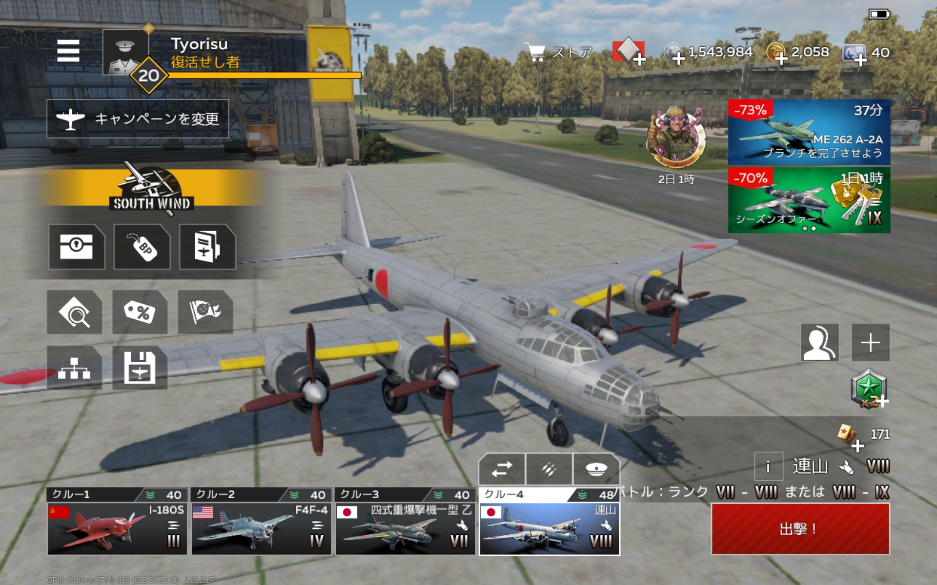 B-24が思いのほか強かったので連山も同じくらい強いのでは?と思い買ってみました。公式機種は大型陸上攻撃機。失敗に終わった深山に代わる機体として期待された、という所まではよく知られた話。ただ連山の設計が始まる頃には帝国海軍でも4発機による敵艦隊への雷撃は非現実的なんじゃ?と認識されつつあり、主力艦ではなく後方の低速輸送船団や航続距離の長さを生かした敵泊地での雷撃が行われる予定だったそうです。更に試作機が初飛行する頃になると敵飛行場への爆撃が第一の任務とされ、魚雷を搭載したことは一度も無いんだとか。台湾フィリピン間程度の距離なら既存の一陸攻でも可能であったため、B-29の発進基地になっているサイパンやグアムへの報復爆撃を行うつもりだったとも言われています。開発自体は順調だったものの、本土決戦が間近に迫り、連山よりも他の機種を優先すべきと判断し放棄されました。wtmでは爆弾積載量が少ない代わりに20mm機銃座を4挺指向可能という、一見するとなんか強そうに見える仕様。だがしかしB-29だけでなくB-24やJu288あたりと比べても明らかに撃たれ弱く、防護火器の強さを全く生かせません。。。それを抜きにしても4発機のくせにベースを1確できないのはねえ?使うのはやめておけと申し上げる。