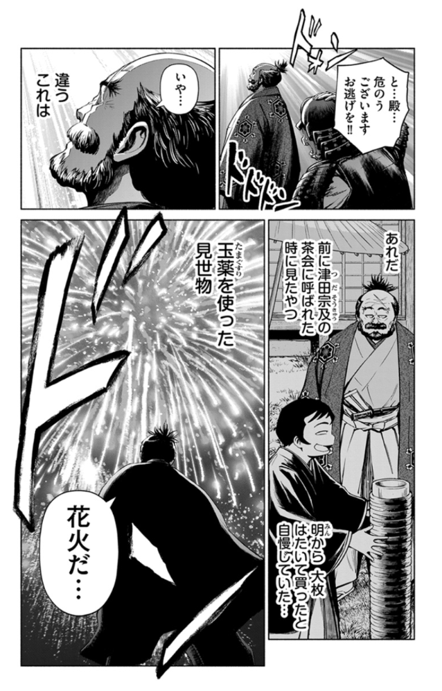 一度は武力で応じることを考えたものの、主人公が打ち上げた花火を見て考えを改める久秀。武人であると同時に文化人でもあるからこそ伝わるネタですな。史実と同じく信長の仲間になりそうな雰囲気で第53話おわり。次話へ続きます。